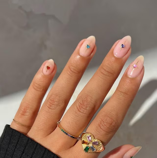 These details look great on a nude, pale pink, or pastel base and work beautifully across all seasons. Add a single heart per nail or mix patterns like a heart on one nail, a star on the next, and a dot pattern on another.